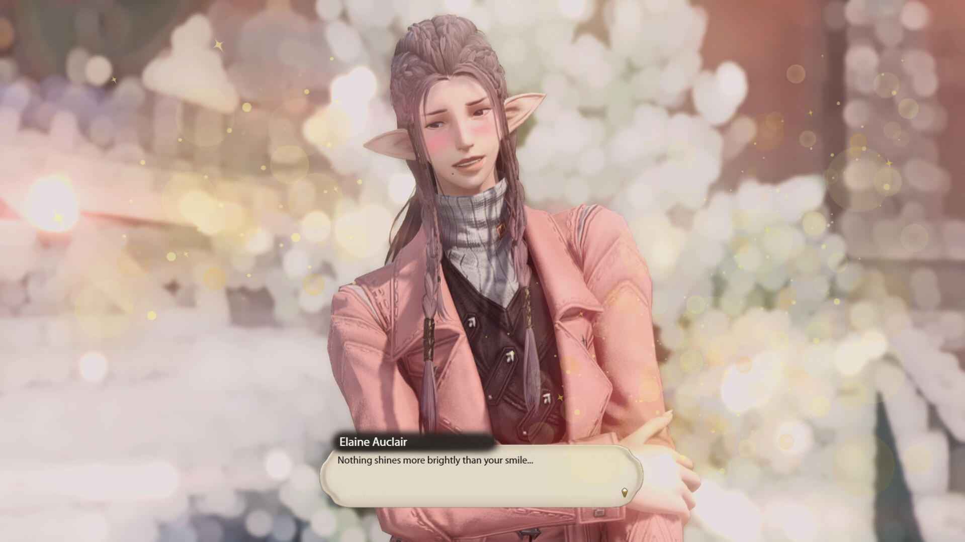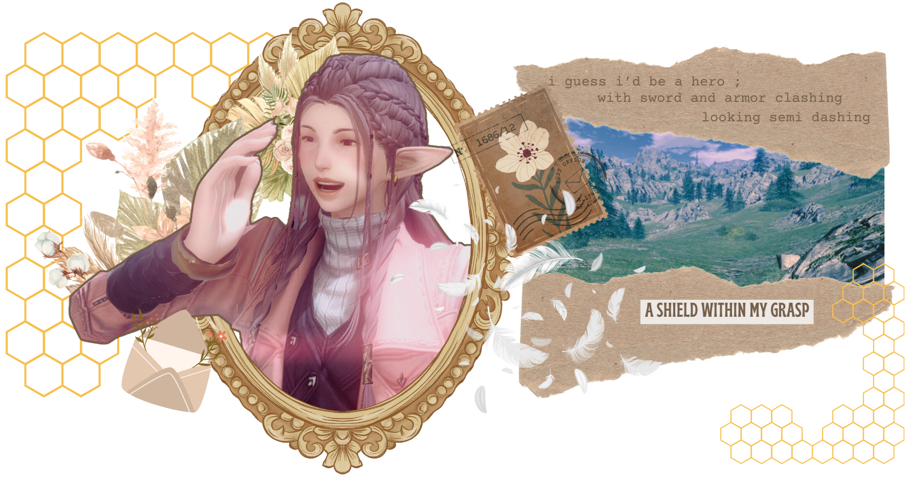 A loyal and faithful follower of Halone, Elaine believes she received a vision of a servant of her goddess on a visit to the nearby convent as a girl. Until that visit, she regularly suffered beestings collecting honey from the Sisters.She was never stung after that point.Elaine wears a rosary in her hair of beads carved from the ruins of that church, after the freeze. Even now she swears she hears the word of Halone when it's most important.Do you recognize her?