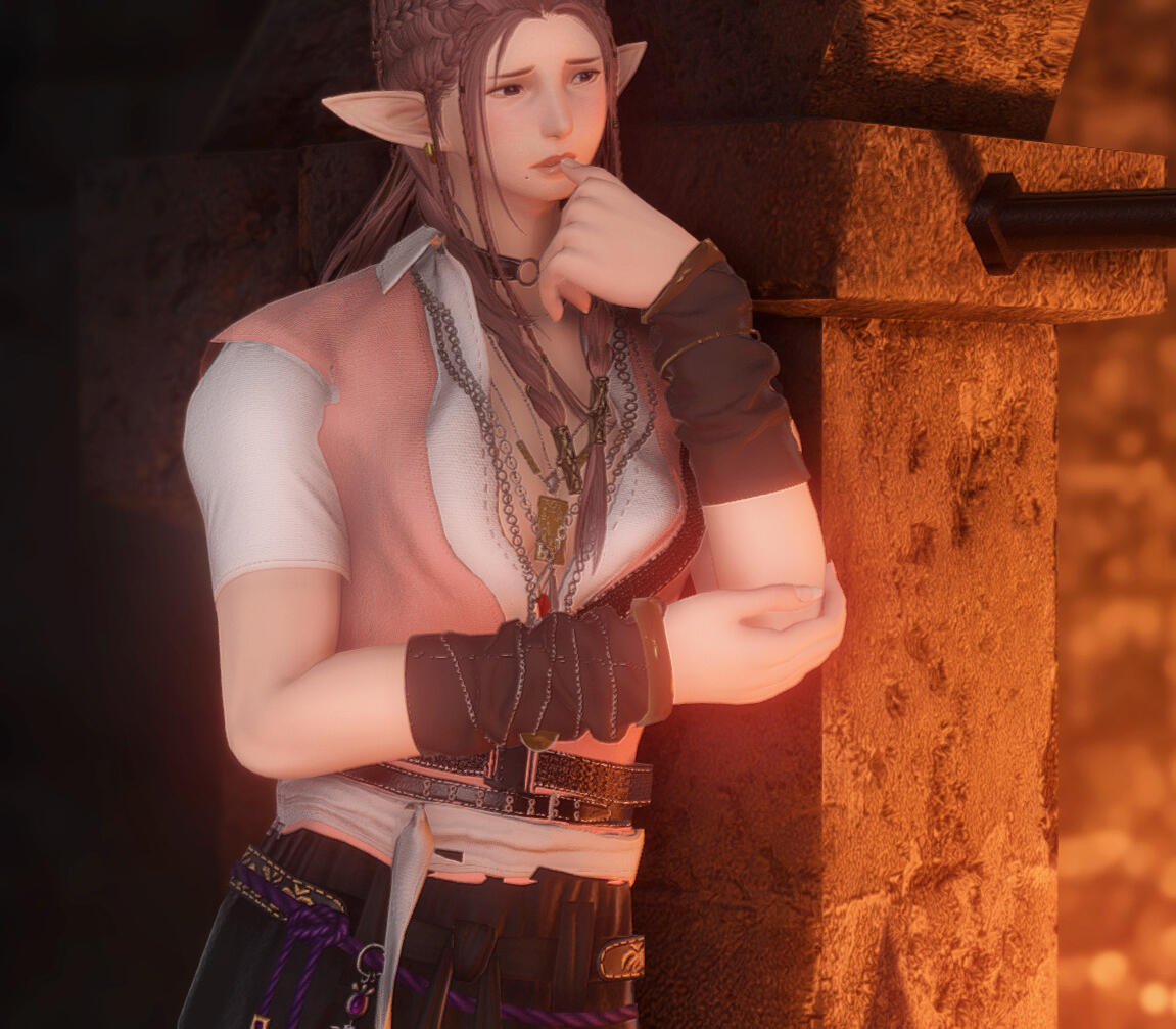 Elaine has lived in Coerthas all her life. Initially as a farmer's daughter in the lowlands, then as a baron's sell sword in what was effectively a private army defending his land, and then as a familiar face in the Brume - she worked just about every job she could at that point.Where do you know her from? Good hook for longstanding acquaintances or old friends.